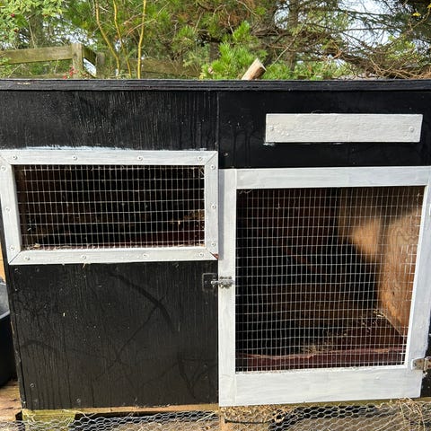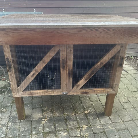 Kaninbur gives væk. Hjemmebygget. Brugt. Udvendigt mål: 75×131. Der mangler en stige/rampe og lidt plastik på taget. Tidligere beboere havde pelsmider, men det har været ubeboet siden april. Det er tungt, så der skal to til at løfte.