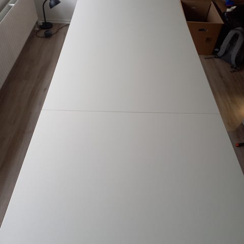 Der er to tillægsplader til bordet, der nemt kan lægges i. Måler 260 cm når de er i.