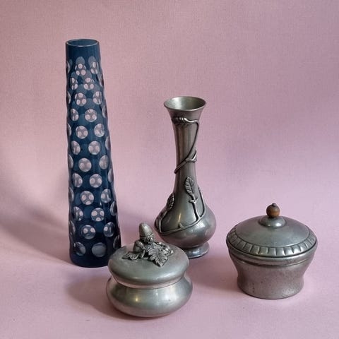 #vintage #retro #genbrug #paentgammelt #loppefund #loppe #ditmarurbach #vase #spejl #håndspejl #tin #lågkrukke #pilleæske