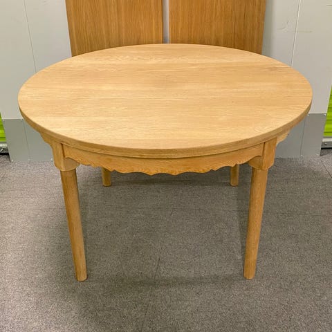 Lækker rundt spisebord i massiv egetræ med udtræk, to tillægsplader. H. 72 cm. Tillægsplader 50 cm. Spisebord med plader totallængde 228 cm. Fremstår i super stand. Evt kan lev aftales