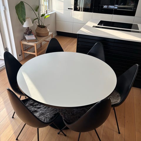 Lækker rundt spisebord i hvid laminat med udtræk, en tillægsplade. H. 73 cm. Tillægsplade 50 cm. Spisebord med plade totallængde 150 cm. Fremstår i super stand. Evt kan lev aftales