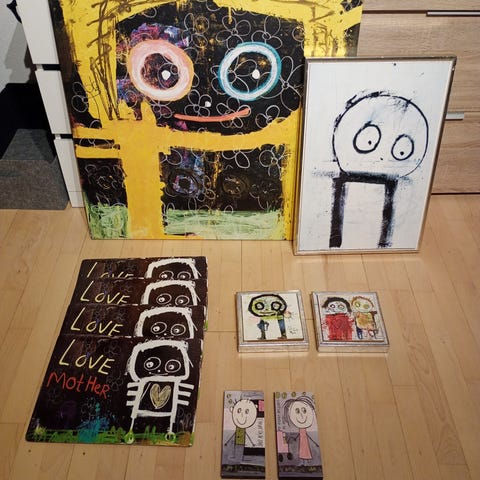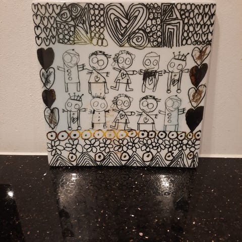 sort-hvidt , fremstillet i keramik. kunstnerisk design med figurer og hjerter, og kan bruges som billed eller bordskåner eller noget helt andet. Måler 20,5 x 20,5 .