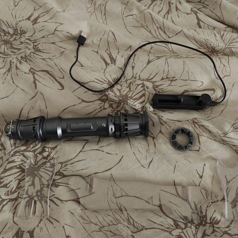 Sælger mit Darth Maul lyssværd/lightsaber replika. Det kører på Neopixel og har lyd og lys, samt sving effekter.