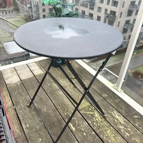 Udendørs bord fremstillet i sort metal med en plade bestående af parallelt placerede lameller. Bordet har et rektangulært design og firkantede ben.Fint praktisk vedligeholdelsesfrit havebord.