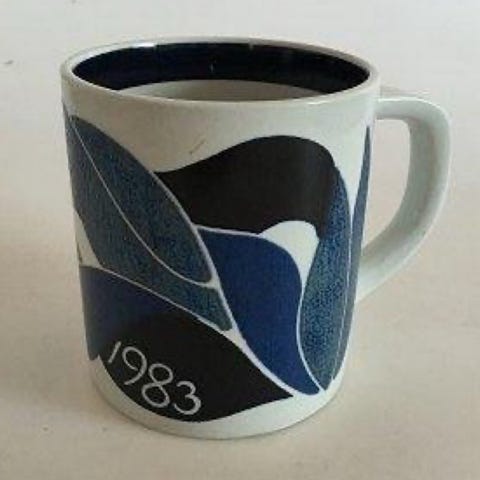 Flot Royal Copenhagen 1. sortering lille Årskrus fra 1983 i blå og sort porcelæn. Designet af Jens Windfeld Hansen. Kruset måler Ø6,6 cm., H: 7,5 cm.