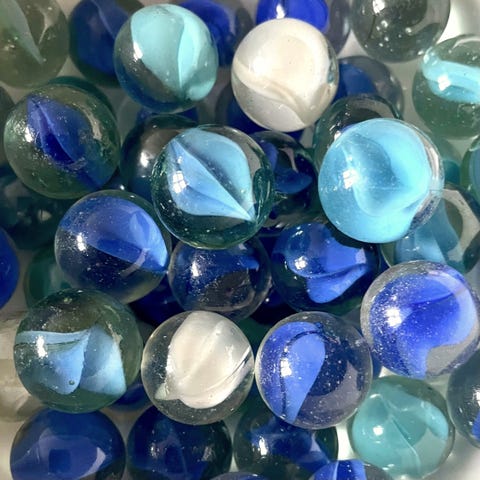 Marmorkuglerne er fra slutningen af 70erne og de fleste har nogle medfødte små luftbobler eller små urenheder/glasrester i glasset ellers fremstår de i pæn stand med alm. aldersrelateret brugsspor. Se også fotos for stand.