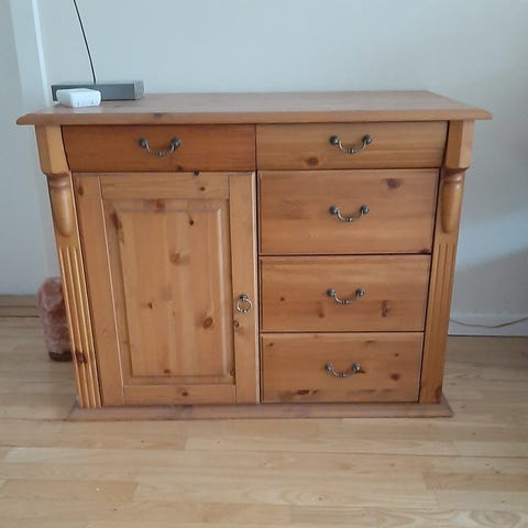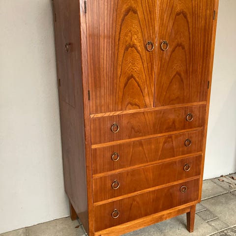 Skøn og rummelig kommode fra 1960’erne. Dansk design i lækkert eg eller valnød. Virkelig praktisk til soveværelse, stue eller sommerhus - både til opbevaring, barskab eller lignende. To rum i hver side og et stort i midten. Solid og lækker kvalitet. Kan leveres. L 90 cm H 69 D 44,5.