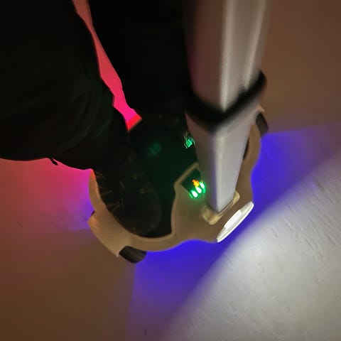 Hoverboard/segboard i rød farve med to hjul og fodplader med skridsikkert mønster. Leveres med blå bære-/opbevaringstaske samt oplader. Egnet til transport og fritidsbrug. Afhentes i Søborg