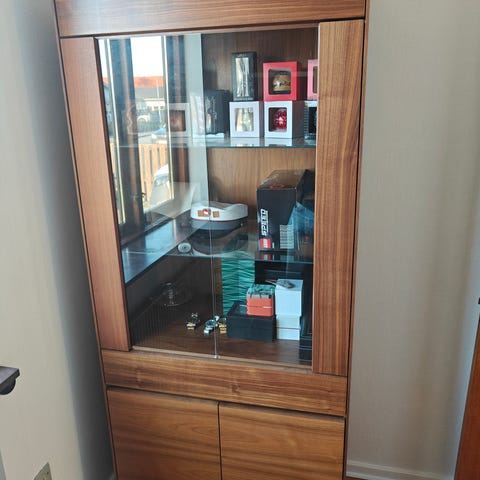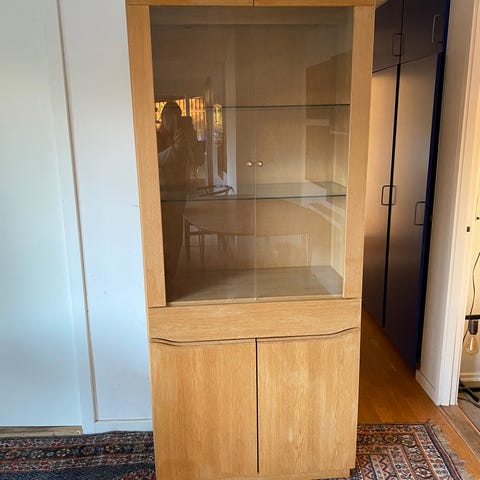 Skabet har glaslåger og glas-hylder og fremstår i pæn stand med almindelige, alderssvarende brugsspor. Ingen skader på glas. Perfekt som vitrineskab i stue eller spisestue.