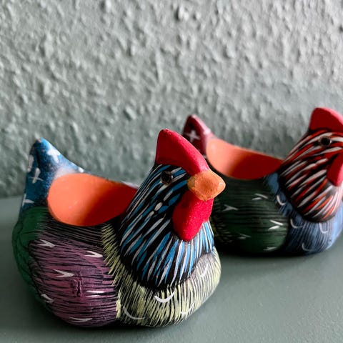 Farverige Portugalhaner 4 stk, 2 æggebægre samt træ-montre med glaslåge.