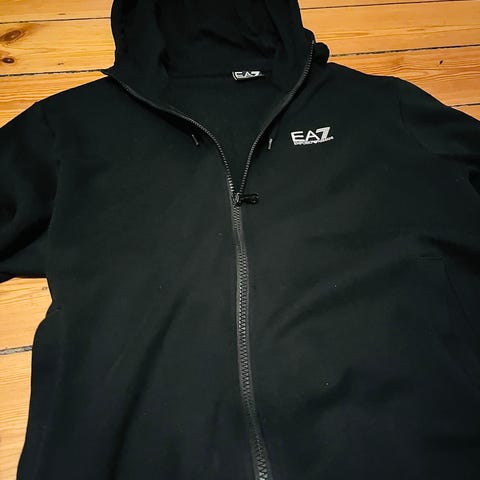 Armani EA7 jakke/trøje i sort med hvide detaljer, lavet af 72% bomuld, 22% polyester 8% lycra. Herretrøje str. L. Den har lynlås foran og detaljer med logo på bryst og ærme.