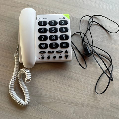 Doro PhoneEasy 311cs fastnettelefon i hvid farve. Telefonen har store knapper og en tydelig skærm, hvilket gør den velegnet til brugere, der har brug for en enkel og overskuelig telefon.