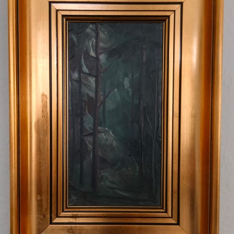 F. U. Reisby maleri af et skovlandskab. Maleriet er udført på lærred og indrammet. Motiv viser træer og skovbund med naturlige farver.