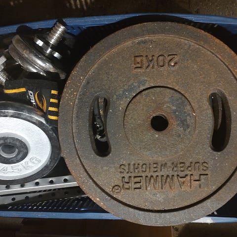 ✔️ 116 kg vægtskiver i flere størrelser: 4x15kg, 2x10kg, 2x5kg, 8x2,5kg, 4x1,25kg og stangen vejer 10kg. Det skulle gerne give 126kg max belastning.