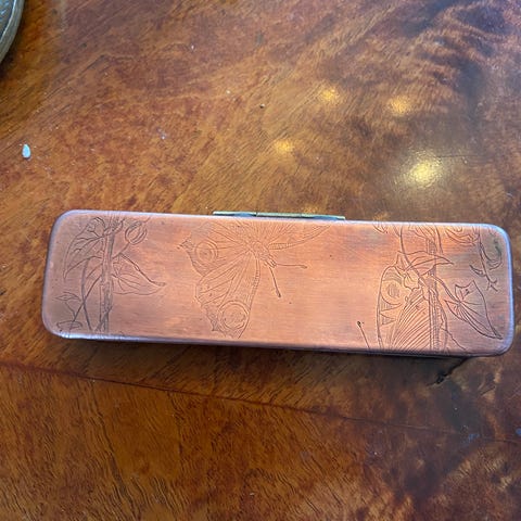 Snus/tobaks æske ,Hollandsk kobber/messing med motiv 12,5 cm lang, 4 cm. høj, 55 cm bred