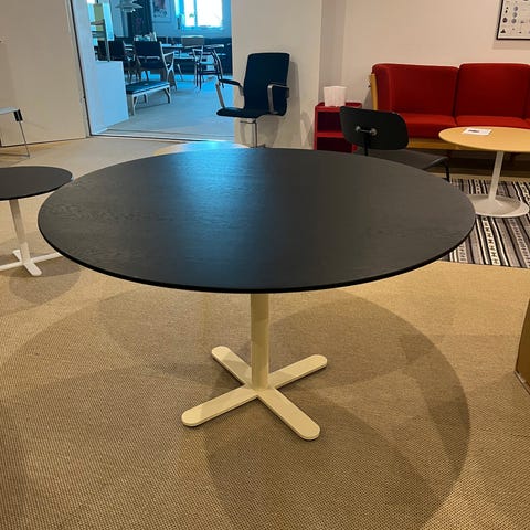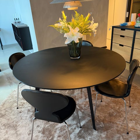 Sælger mit Montana Panton spisebord sort med mat linoleumsoverflade, som er nemt at rengøre. Bordet måler Ø90 x H72 cm og står i rigtig flot stand.
