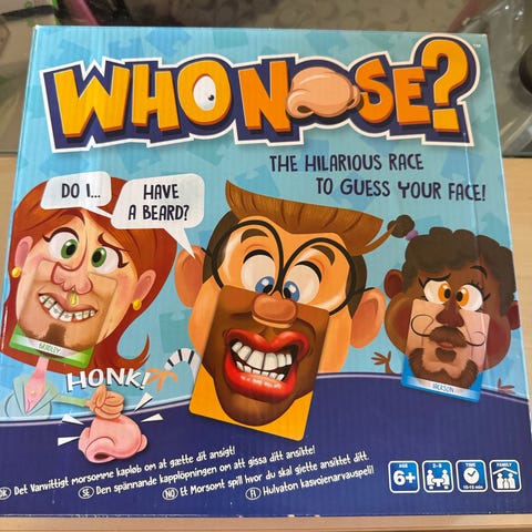Pencil Nose familiespil med 250 opgavekort. Spillet indeholder en orange ramme, briller, tusch, og forskellige kort til opgaver. Egnet til børn fra 8 år og op.