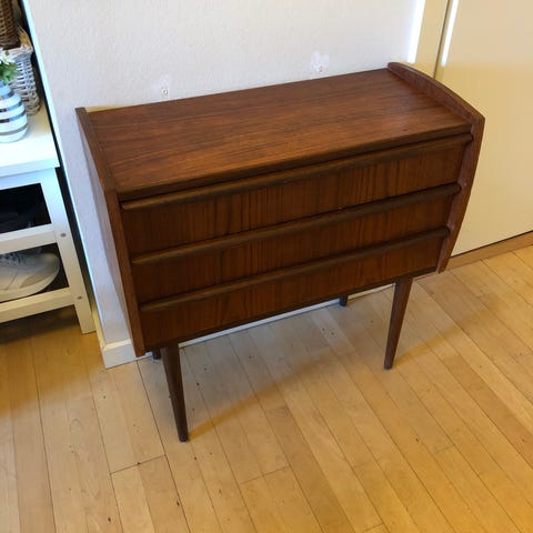 Fin lille kommode i teak. Svensk. God stand men med synlige skjolder. Se fotos