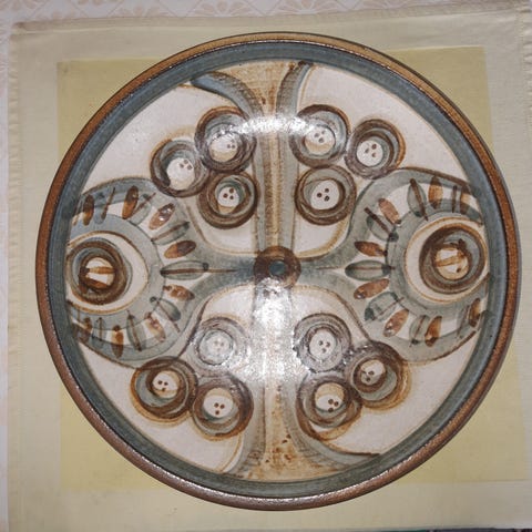 Søholm Keramik tekande med hank, dekoreret med cirkulære mønstre i beige og grønne nuancer. Tekanden er rund med en hank i metal med flet.