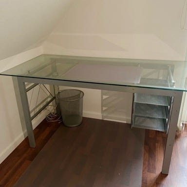 Skrivebord med glasplade og metalstel inkl. rullende skuffeelement (med hængemapper). Der er en udtræksskuffe til tastatur under skrivebordet (se billede).
