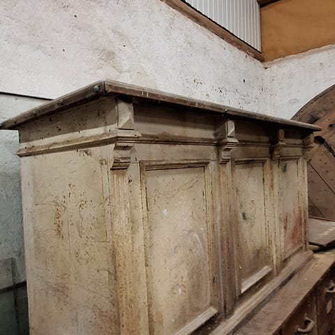 Brede 173cm. dybde 56cm. højde 85cm. Gedigen gl. disk med 6 skuffer. Afstand mellem skuffer og underkant bordplade 35cm.