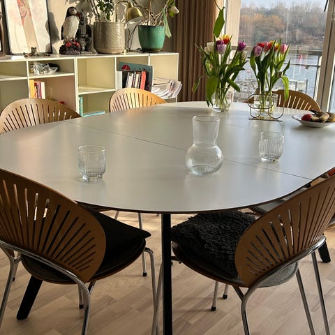 Der er 2 udtrækplader i - det kan også blive til rundt bord.