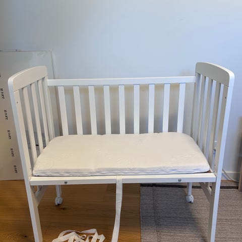 Babydan bedside crib inklusiv to madrasser for ekstra comfort og side der kan tages af og på afhængigt af om man vil bruge den som bedside eller almindelig seng. Der kan godt følge lagen med i købet hvis det ønskes. Er nogle år gammel men står i... Læs mere