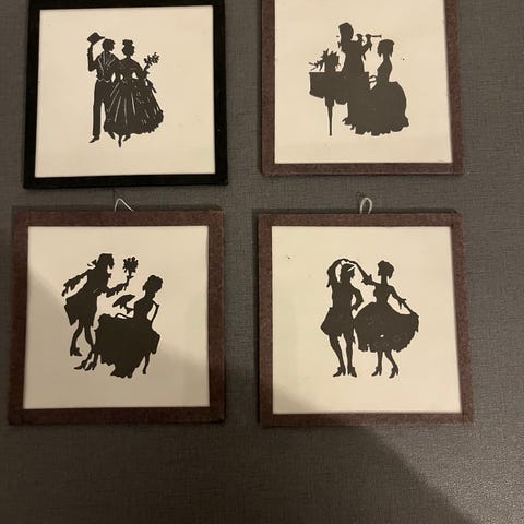 Sæt bestående af religiøse ikoner og silhuet billeder. Indeholder tre religiøse ikoner med gyldne rammer og tre silhuet billeder i sort-hvid. Velegnet til dekoration eller samling.