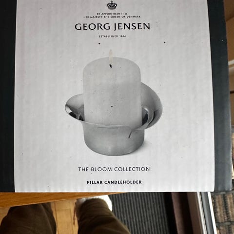 Georg Jensen Bloom Collection lysestager sæt til dekoration ved andre højtider. Sættet indeholder to lysestager i blankt metal med en rund og organisk formgivning, designet til at holde lys. Lysestagerne er pakket i original emballage.