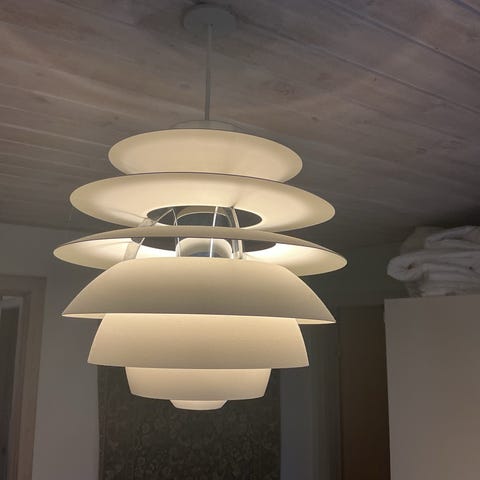 Louis Poulsen PH lampe designet af Poul Henningsen. Lampen har et karakteristisk lagdelt design med hvide skærme og en central orange detalje. Den er egnet til ophæng i loft og skaber et diffust og blødt lys.