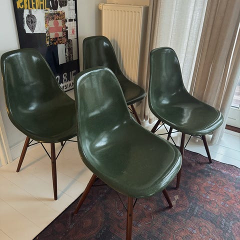 Sjælden samling af de oprindelige og helt rigtige Eames DSW stole med skal af glasfiber på originalt stel. Stolene fremstår i god og ensartet stand med flot patina på både skal og stel.