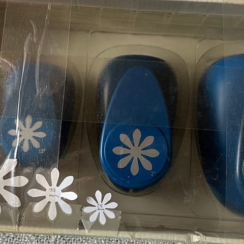 Papirudstanser i to forskellige designs med stjernemønster. Den ene er gul med en stor stjerneudstanser, den anden er hvid med en rulleudstanser til kantmønster. Anvendes til dekoration og udskæring af papir til kreative projekter.