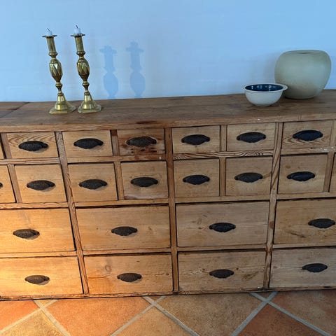Skøn, gammel købmandsdisk med mange år på bagen! Hvis man har hænderne kan man give den nyt liv men ellers er den bare så sjælfuld, lige som den er. Der medfølger originale skuffer- nogle i bedre stand end andre.
