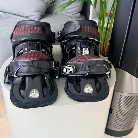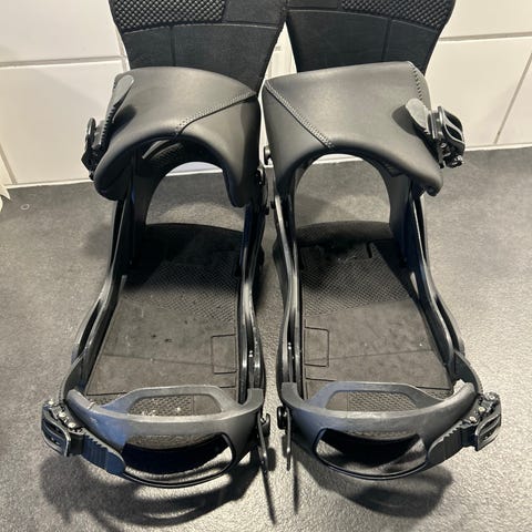 Salomon snowboardbindinger i hvid farve. Bindingerne er designet til at fastgøre snowboardstøvler sikkert til snowboardet og sikre kontrol under kørsel. De har justerbare stropper og spænder for tilpasning til forskellige støvler. Der er knækket lidt af plastik på den ene, derfor prisen lav