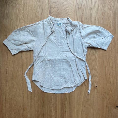 b) Karryfarvet bluse m sandfarvede store prikker fra VERO MODA , og med rynkekant på både