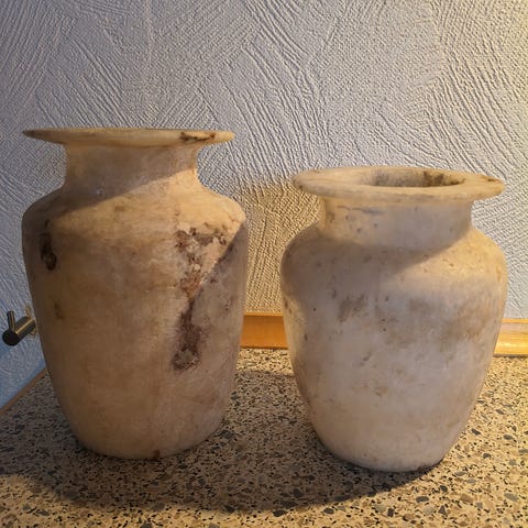 Egyptisk Museum Alabast Kop håndskåret i alabast med dimensioner på 10 x 5,5 tommer. Koppen har en klassisk form og en lys, marmoragtig overflade.