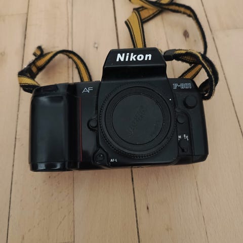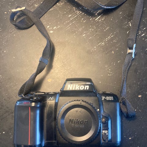 Nikon F-401 SLR kamera i sort farve. Kameraet har et traditionelt spejlrefleksdesign og leveres uden objektiv. Velegnet til fotografering med manuel objektivmontering.
