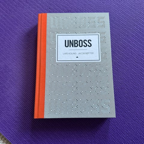 Unboss bog med orange ryg og mønstret omslag. Indeholder tekst af Lars Vollund og Jacob Bøtter. Bogens design inkluderer en kombination af hvid, sort og orange farver.