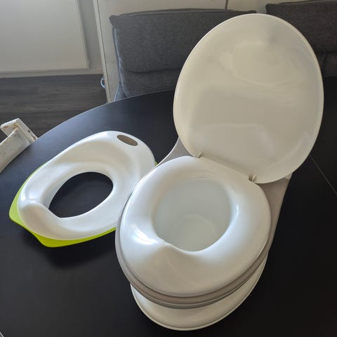 Super smart toiletsæde, så dit barn selv kan gå på toilettet. Det kan nemt klappes sammen og sættes til side.