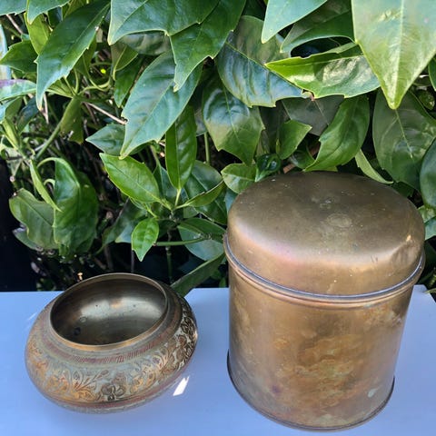 Vintage messing cloisonné skål med påfugl- og blomster emalje motiver i flotte farver og kammuslinge kant. Den sidder på en lille piedestal/fod. Lavet i Indien.