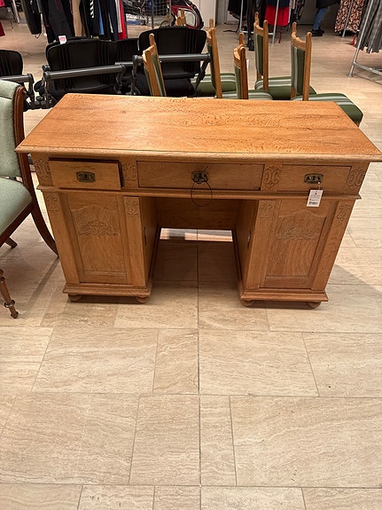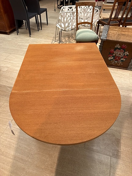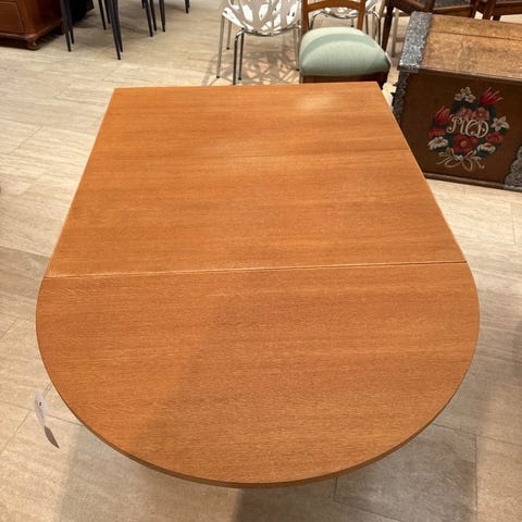 Bordet har en rund form med ribbet træstruktur og metalben. Det har en rød overflade.,Afhentes i:,Røde Kors Kolding (621),Bemærk at mail, chat og beskeder ikke besvares, og varen skal købes på knappen "Gå til varen"