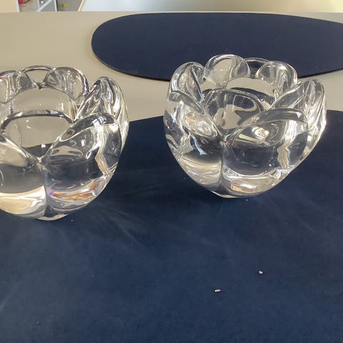Holmegaard og Royal Copenhagen glas lysestager sæt bestående af 7 stk. Hver lysestage er fremstillet af klart glas med forskellige blomsterinspirerede former. Designet til at holde små fyrfadslys, velegnet til dekoration og stemningsbelysning.
