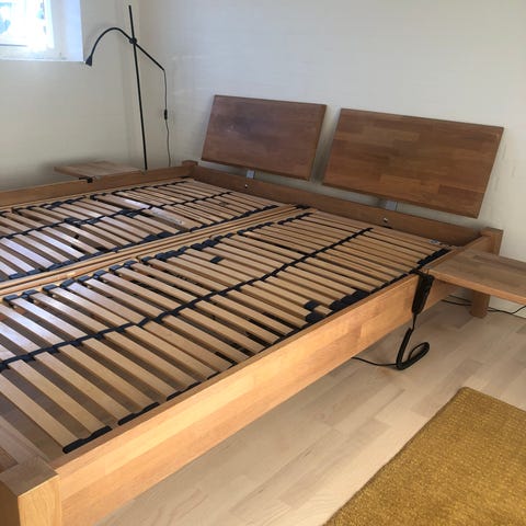 Denne behagelige lamelbund med elevation vil få dig til at elske din seng endnu mere! Lamelbunden har et stel i massivt bøgetræ og lameller i birk, så den er robust og holdbar. De syv komfortzoner tilbyder optimal støtte til din krop. Begge ender af lamellerne holdes på plads af SBS-hætter i gummi for bedre stabilitet af hele strukturen. Takket være de fire justerbare, dobbelte lameller i midterzonen kan bundens fasthed tilpasses efter dine behov. Hoved- og fodområderne er justerbare med en fjernbetjening for din bekvemmelighed. Bemærk venligst: Pakken indeholder kun en lamelbund; en madras og et sengestel medfølger ikke. Godt at vide: Montering er nødvendigt grundet forsendelsesrestriktioner, der begrænser pakkestørrelsen til maks. 120 cm. Farve: Antracitgrå, lysegrå, sortMateriale: Massivt bøgetræ, birk, krydsfinérMål: 195 x 90 x 9 cm (L x B x H)Passer til madrasstørrelse: 90 x 200 cm (B x L) (madras medfølger ikke)Mål, fjederlameller: 35 x 8 mm (B x T)Mål, krydsfinérslameller: 50 x 20 mm (B x T)Mål, bøgetræslameller: 45 x 20 mm (B x T)Med 28 lameller4 dobbelte lameller med justérbar fasthedMed 7 zonerMed sort strop i midtenMed dobbelte SBS-hætter i gummi til at holde lamellerneSBS-gummihætter (16 antracitgrå holdere + 12 lysegrå holdere)Justerbar i hoved- og fodområderneMotor OKIMAT 4 IPSeMed kabelbetjeningIndgangsspænding: 230-240 V ACUdgangsspænding: 24 V DCIP-tæthed: IP20Dobbelt kørselMaks. last per side: 5500 NJustérbar hastighed 3,8 mm/sekundet ved 5500 NRyg-/bensektionens slaglængde: 69/74/87 mmStrømforbrug i standby-tilstand: < 0,5 WMontering/samling påkrævet: Ja Dette apparat er ikke beregnet til brug af personer (herunder børn) med nedsatte fysiske, sensoriske eller mentale evner, eller manglende erfaring og viden, medmindre de er under opsyn eller er blevet instrueret i brugen af apparatet af en person, der er ansvarlig for deres sikkerhed. Dette produkt er ikke legetøj. Lad ikke børn lege med apparatet. Kun til indendørs brug.