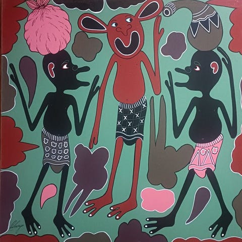 Dette er et enestående værk på lærred af den store afrikanske kunstner George Lilanga.