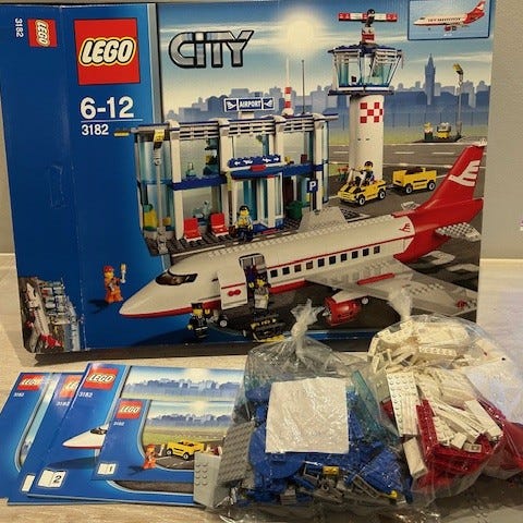 LEGO City Lufthavn sæt med fly, terminalbygning, tårn og bagagevogn. Sæt #3182 med 703 dele fra 2010.
