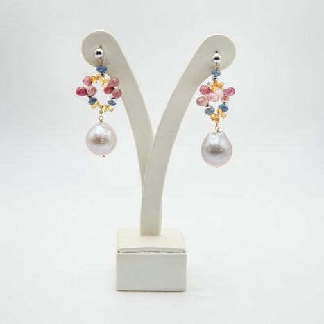 Øreringe i rosa guld 18 kt med to ferskvandsperler i front, udsmykket med funklende rubiner, intense lapislazzuli og kvarts. En harmonisk blanding af farver og former, der giver naturlig elegance og raffineret bevægelse.