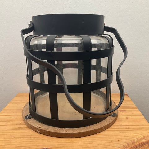 Dette er en meget smuk lanterne. Den er lavet af metal med en flot guld/brass finish og ser meget smuk ud, når der er en stor stearinlys tændt i den.