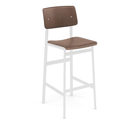 Designet af Thomas Bentzen, for Muuto Barstol, model Loft Bar Stool / Loft Counter Chair. Sortlakeret stel af metal, sæde og ryg af dark stained egetræfiner.