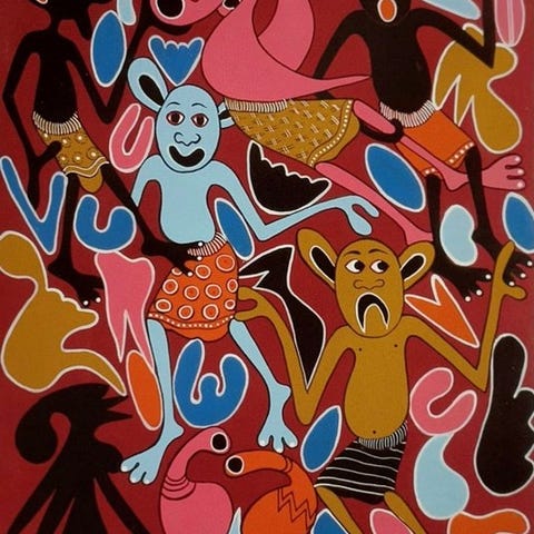 George Lilanga, olie-måneders billed fra 1999 med titel Nawatakieni Safari Njema, Naiv Kunst stilleben fra Tanzania, 61 × 61 cm, signeret, originaludgave, i god stand, vægt 5 kg. Klik på den blå "gå til varen" knap, for at købe eller byde på denne vare. Den samlede pris vil blive vist inden du afgiver dit bud.