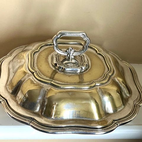Et rigt dekoreret, tungt forsølvet serveringsfad i rokoko-revivalstil med dristigt snirkelarbejde, blomstermotiver og et skulpturelt aftageligt håndtag. Den elegante, bølgende kant og den meget detaljerede finial gør fadet til et iøjnefaldende midtpunkt på et bord eller en skænk. Fadet består af tre dele: bund, låg og aftageligt håndtag.